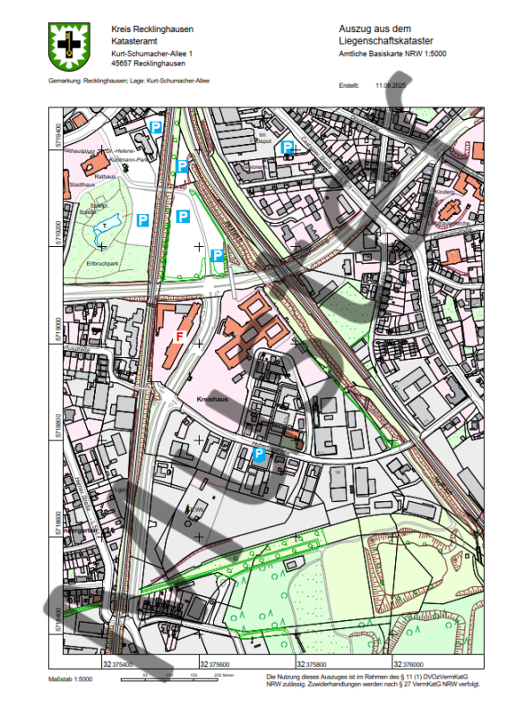 Tarifstelle: 3.2.1 - Standardausgabe aus dem Liegenschaftskatasterinformationssystem ALKIS, gegebenenfalls einschließlich einer amtlichen Beglaubigung.